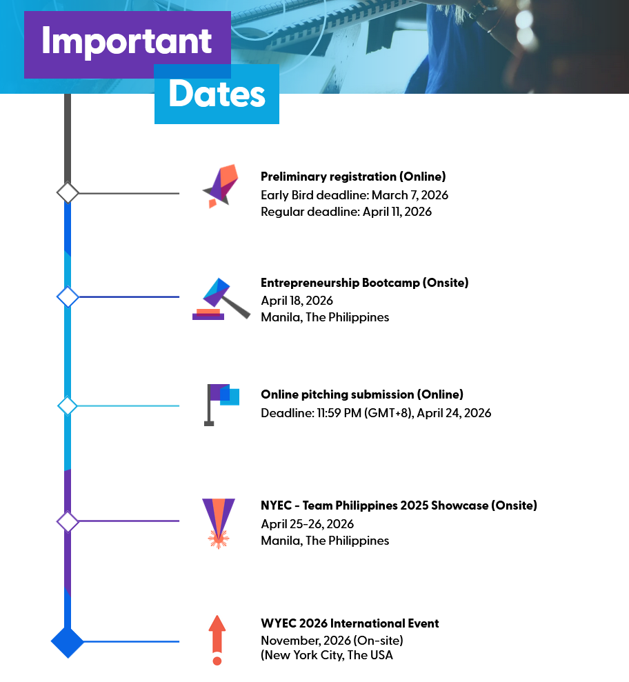 The winning team of NYEC Philippines 2026 will earn the exclusive honor of becoming the official national delegation representing the Philippines at the World Youth Entrepreneurship Challenge (WYEC) 2026 in New York.
